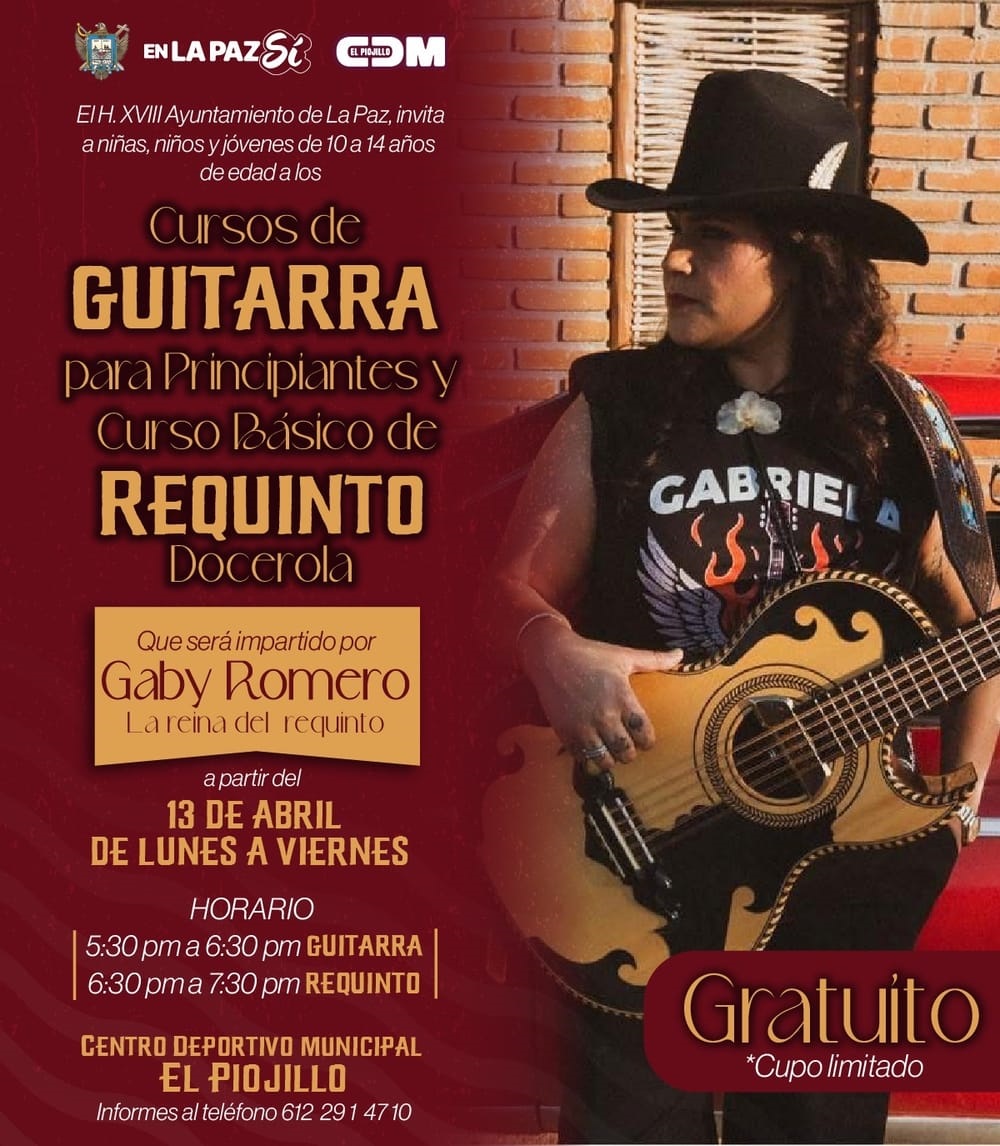 Como parte de las acciones impulsadas por la alcaldesa de La Paz, Milena Quiroga Romero, para fortalecer el desarrollo integral de la niñez y juventud, la reconocida intérprete y requintista sudcaliforniana, Gaby Romero, ofrecerá dos cursos gratuitos para quienes tengan interés por aprender a tocar la guitarra y el requinto docerola en nivel principiante.