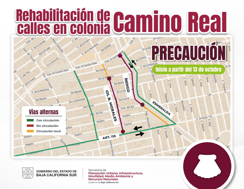 Con el compromiso de mejorar la movilidad urbana y brindar espacios más seguros y funcionales para las familias, el Gobierno del Estado, a través de la Secretaría de Planeación Urbana, Infraestructura, Movilidad, Medio Ambiente y Recursos Naturales (SEPUIMM), informó que esta semana inician los trabajos de reconstrucción de dos vialidades en la colonia Camino Real, municipio de La Paz, con una inversión de 8 millones de pesos.