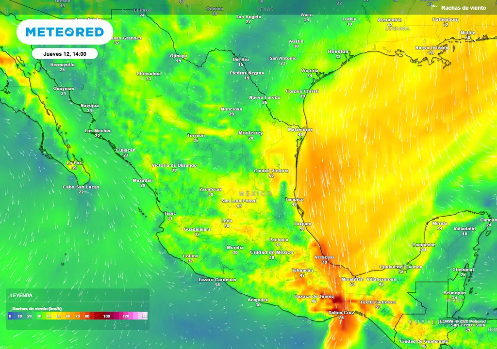 De 75-95 km/h son probables las ráfagas en costa central de Veracruz al mediodía y comienzo de la tarde, respondiendo el Istmo con más de 100 km/h por la tarde-noche; en la Sonda de Campeche y en general, costas de la península será más débil con 40-60 km/h, siendo similar en el Altiplano desde el Bajío al Valle de México. El viernes habría cedido por completo.