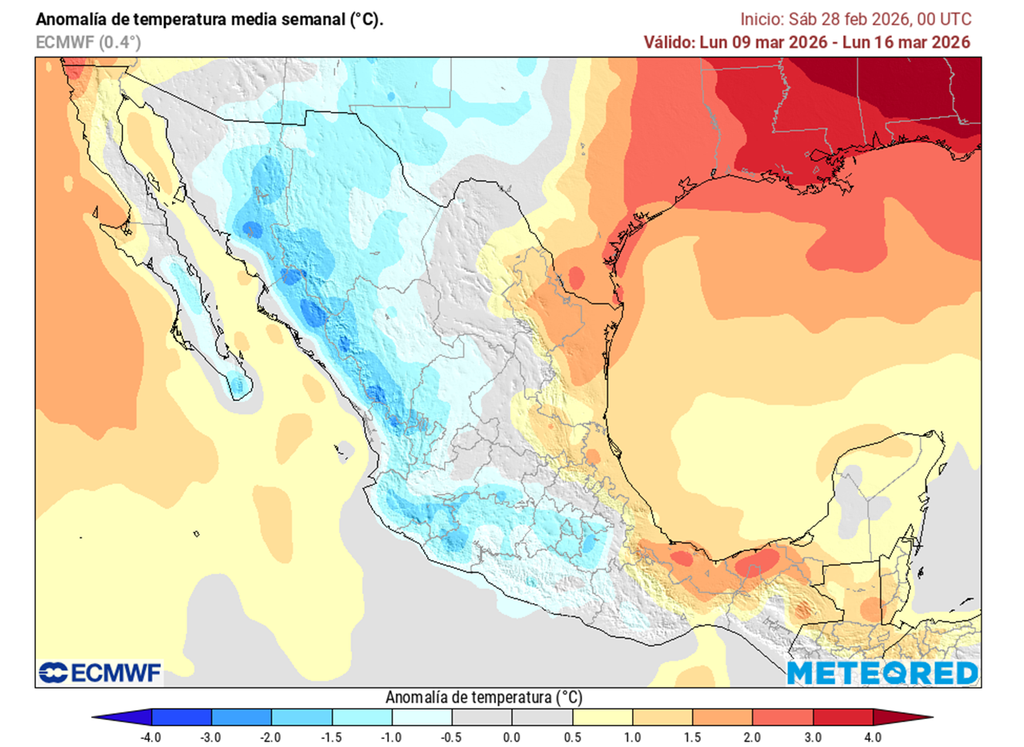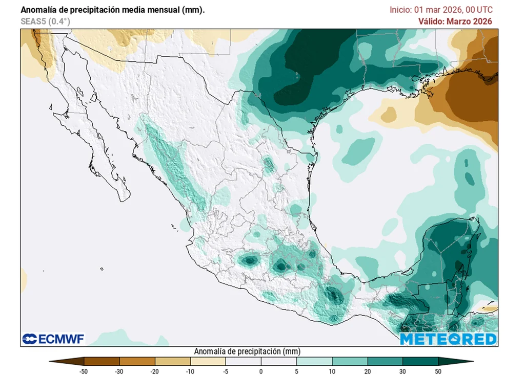 Se mantiene que marzo será contrastante con estados del norte más calurosos donde las anomalías podrían ser +5°C. En contraste, la mitad centro, sur y parte del oriente-sureste, el calor sería menor de lo habitual al presentarse periodos lluviosos y con masas polares. Aunque el norte sea caluroso, aire polar también refrescará eventualmente.