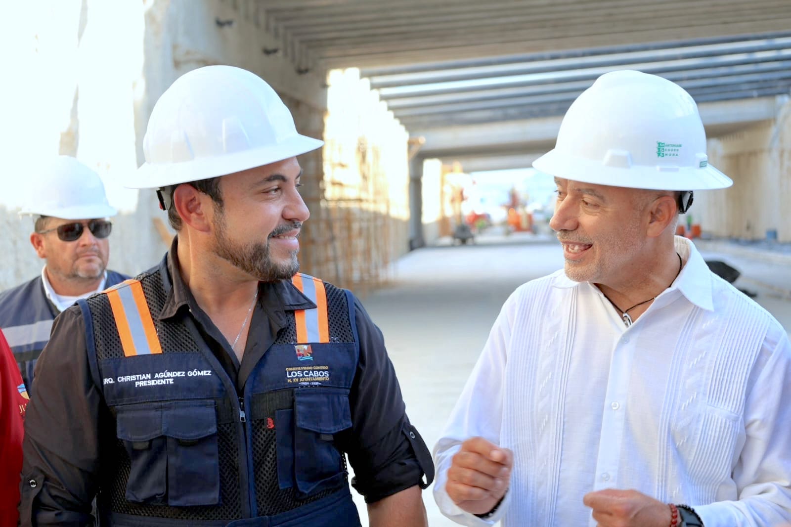 Los Cabos, Baja California Sur.- “Estamos muy agradecidos por esta magna obra, confiamos en que este proyecto sea una realidad probablemente este 30 de abril”, anunció el presidente municipal de Los Cabos Christian Agúndez Gómez, durante el recorrido de supervisión técnica en el paso a desnivel ubicado en la zona de la Glorieta de las Mujeres Libres, al que acudió junto al titular de la Secretaria de Infraestructura, Comunicaciones y Transportes (SICT), Jesús Antonio Esteva Medina y el gobernador de Baja California Sur Víctor Manuel Castro Cosío.